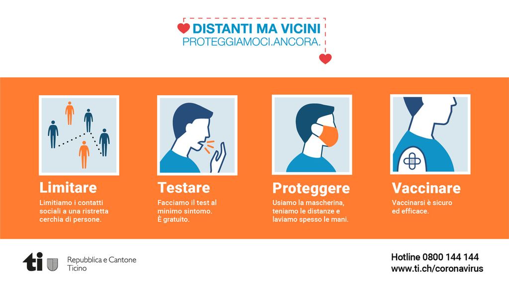 Considerati gli allentamenti previsti dal Consiglio federale e l’uscita dalla fase critica della seconda ondata, il Consiglio di Stato ha infine deciso di adeguare la campagna di sensibilizzazione «Distanti ma vicini»: a partire dal 1. marzo, al posto dell’attuale colore rosso i messaggi delle autorità cantonali saranno accompagnati dal colore arancione. Questo passaggio esprime la fine di una situazione critica e, al contempo, richiama i cittadini alla necessità di rimanere vigili. Il Governo ricorda infatti che la situazione rimane delicata e fragile, e che la presenza di varianti del virus impone a tutta la popolazione di continuare ad attenersi scrupolosamente alle raccomandazioni di comportamento e alle disposizioni cantonali e federali.