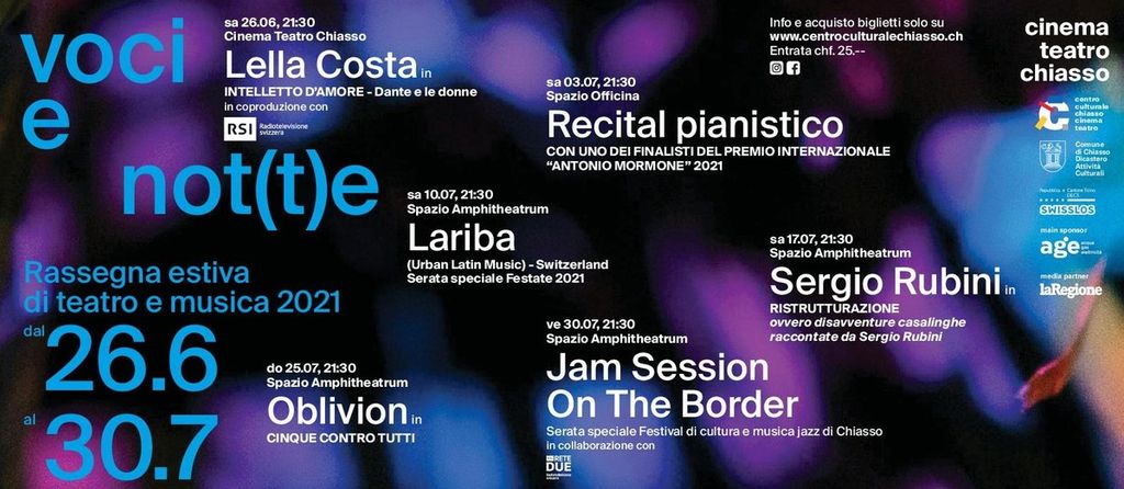 La rassegna “VOCI E NO(T)E 2021”, proposta dal Cinema Teatro e dal Centro Culturale Chiasso, è resa possibile grazie al Dicastero Attività culturali del Comune di Chiasso con il sostegno della Repubblica e Cantone Ticino-Fondo Swisslos e di AGE SA.