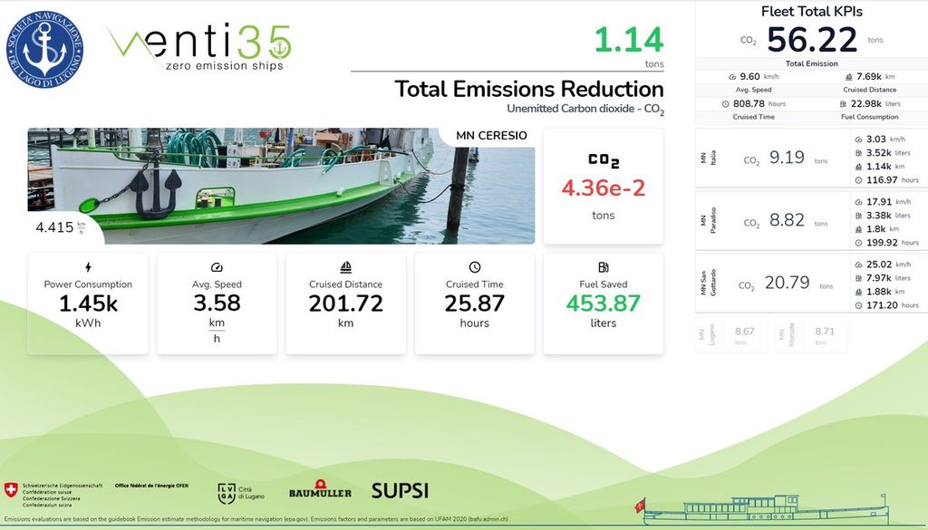 Gli importanti traguardi raggiunti dal natate vengono giornalmente monitorati grazie alla messa in funzione di un apposito dispositivo, realizzato in collaborazione con il Dipartimento tecnologie innovative della SUPSI nell’ambito di un progetto di tesi realizzato da uno studente del Bachelor in Ingegneria informatica. Il dispositivo permette di misurare, visualizzare e archiviare in tempo reale le diverse informazioni tecniche del natante, in particolare velocità e distanza ma soprattutto il CO2 e il gasolio risparmiati durante la navigazione. Per meglio rendere partecipi i fruitori della nave, queste informazioni sono rese visibili ai passeggeri in tempo reale tramite un apposito pannello didattico.