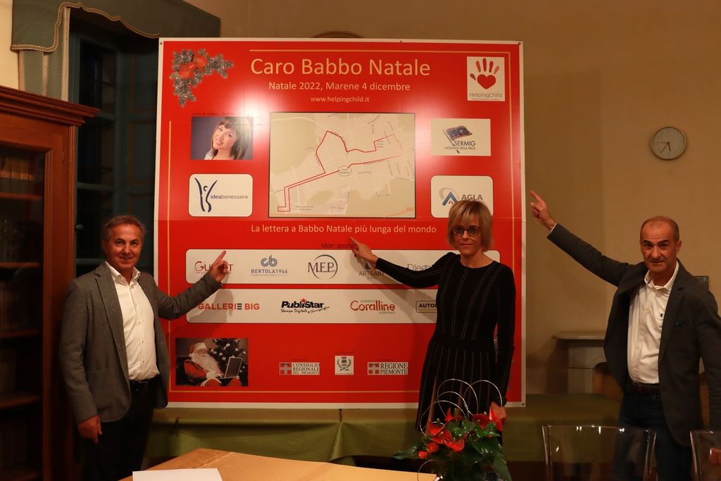 Ha introdotto la serata Roberta Barbero, sindaco di Marene “… siamo contenti e orgogliosi nell’ospitare questo importante evento di beneficenza che coinvolgerà tutto il nostro il nostro paese. Marene ha delle tradizioni che rispetta tutti gli anni e il Natale una di queste dove organizziamo una festa insieme alle varie associazioni del nostro territorio. Quest'anno abbiamo accettato questa bellissima sfida nel voler srotolare per tutto il paese una letterina scritta a Babbo Natale dai bambini lunga quanto il Monviso, la nostra montagna di riferimento”.
