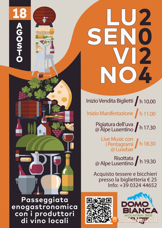 Fra gli eventi top dell’agosto a Domobianca 365 trova certamente un posto “Lusenvino” organizzato domenica 18 agosto. Una passeggiata enogastronomica nel bosco di Foppiano – 20 minuti a piedi dal parcheggio di Domobianca - per scoprire tutti i migliori produttori locali e i loro vini: fra cui il Prunent, il vino a bacca nera autoctono della Val d’Ossola. In accompagnamento la polenta preparata con la farina di Beura e il re dei formaggi ossolani e italiani il Bettelmat. Previste una decina di tappe enogastronomiche e alle 17:30 al Lusebar, per grandi e piccoli, via alla pigiatura dell’uva a piedi nudi: il metodo più antico e tradizionale per estrarre dagli acini il mosto. Alle 18:00 live music dei Pentagrami, sempre al Lusebar prima della risottata che concluderà la giornata. La tessera e i bicchieri sono acquistabili presso la biglietteria ad un costo di 25 euro.