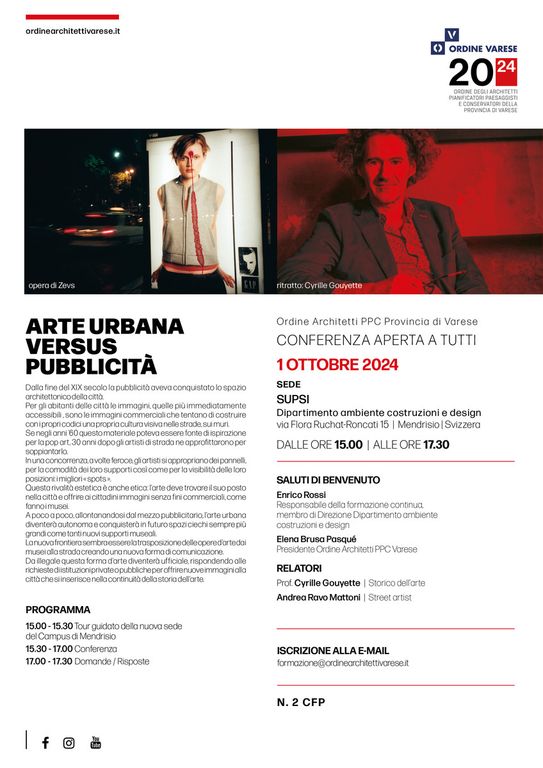 L’Ordine Architetti P.P.C. della Provincia di Varese, in collaborazione con la SUPSI di Mendrisio, organizzano il 1° ottobre alle ore 15.30 una visita guidata alla nuova sede del Dipartimento Ambiente Costruzioni e Design (DACD) della SUPSI e a seguire un’interessante conferenza sul tema dell’arte urbana che sta emergendo nelle città europee e che si sta trasformando in una nuova forma d’arte colta, contemporanea, alla portata di tutti per un nuovo modo di fare comunicazione con una ricchezza di contenuti che spiegherà il prof. Cyrille Gouyette, docente della Sorbona e collaboratore del Louvre per programmi educativi per i giovani e i disabili.