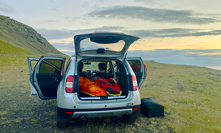 (Fabrizio). "Organizzazione" non è esattamente la parola giusta per descrivere il nostro approccio! La macchina è diventata la nostra casa su quattro ruote per 16 giorni. Le soste erano spesso vicino a laghetti o ruscelli, dove poterci lavare al mattino; il cielo notturno, privo di ogni inquinamento luminoso, ci avvolgeva, e la sensazione era quella di essere davvero soli nell’immensità della natura. Un’esperienza che ti riconnette con la terra e con te stesso. Abbiamo abbassato i sedili posteriori e ci siamo sistemati perfettamente; per quanto riguarda il freddo, avevamo sacchi a pelo professionali, quelli già utilizzati nel viaggio in Nepal. Non abbiamo mai sofferto le basse temperature, nemmeno quando fuori il termometro segnava 5 gradi; forse l’unica notte particolarmente rigida è stata quando abbiamo dormito in tenda in un campeggio. Ma ne è valsa assolutamente la pena perché eravamo a Raudasandur, una spiaggia sabbiosa che sembra un deserto. Un Posto unico !