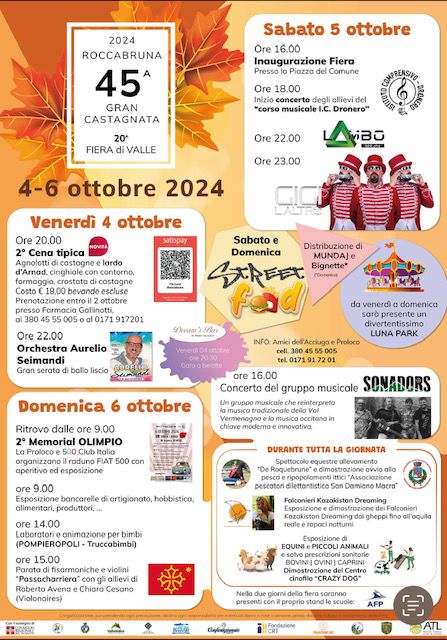 A Roccabruna è in arrivo la 45^ Gran Castagnata e 20^ Fiera di Valle, organizzata per il terzo anno consecutivo dall’associazione Amici dell’Acciuga in collaborazione con la Pro Loco ed il Comune di Roccabruna, sostenuta da Regione Piemonte, Fondazione CRC, Fondazione CRT, ATL del Cuneese, Consorzio Turistico Valle Maira, AFP, Banca di Caraglio e Banca di Savigliano.