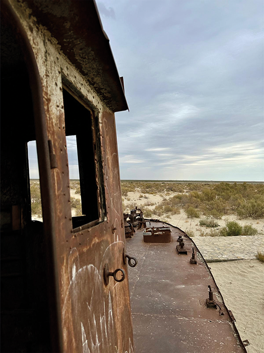 L’impatto con l’Uzbekistan è stato travolgente. Appena atterrato a Urgench, sono ripartito subito per Moynaq, percorrendo 750 km nel cuore del deserto per vedere il lago d’Aral. In passato, copriva una superficie 60.000 km², ma oggi è quasi completamente prosciugato a causa dell’inquinamento ambientale. La città, un tempo florida grazie alla pesca, oggi è un luogo con un paesaggio desolante. Vedere quello che è successo ti scuote profondamente, e ti fa riflettere su quanto l’intervento umano possa devastare un ecosistema. Camminare, in quello che una volta era un luogo vivo, e vedere i relitti delle barche abbandonate è stato impressionante. Parlare con la gente del posto, ascoltare i loro racconti su come le malattie respiratorie abbiano colpito la popolazione a causa dei pesticidi riversati nel lago, ti fa capire quanto irreparabile sia stato il danno dell’uomo.
