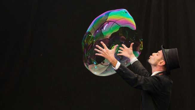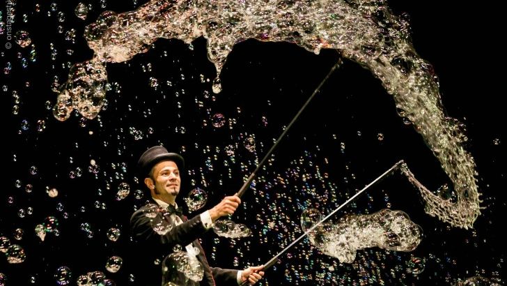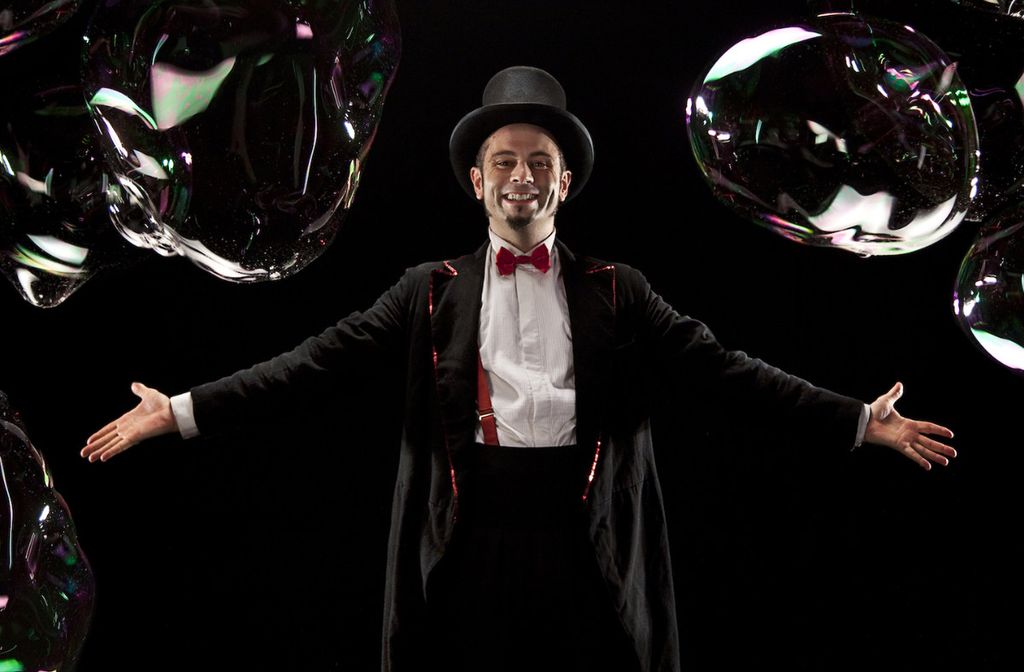 Un eccentrico direttore d’orchestra ci porterà nel mondo fragile e rotondo delle bolle di sapone per un “concerto” dove l’imprevisto è sempre in agguato: da strani strumenti nascono bolle giganti, bolle rimbalzine, bolle da passeggio, grappoli di bolle… mentre i più paffutelli potranno entrare in una bolla gigantesca! Un racconto visuale senza parole che trae ispirazione dalle atmosfere circensi e del varietà, un magico spettacolo di clownerie, pantomima e musica che, nato per i più piccoli, finisce per incantare il pubblico di qualsiasi età.