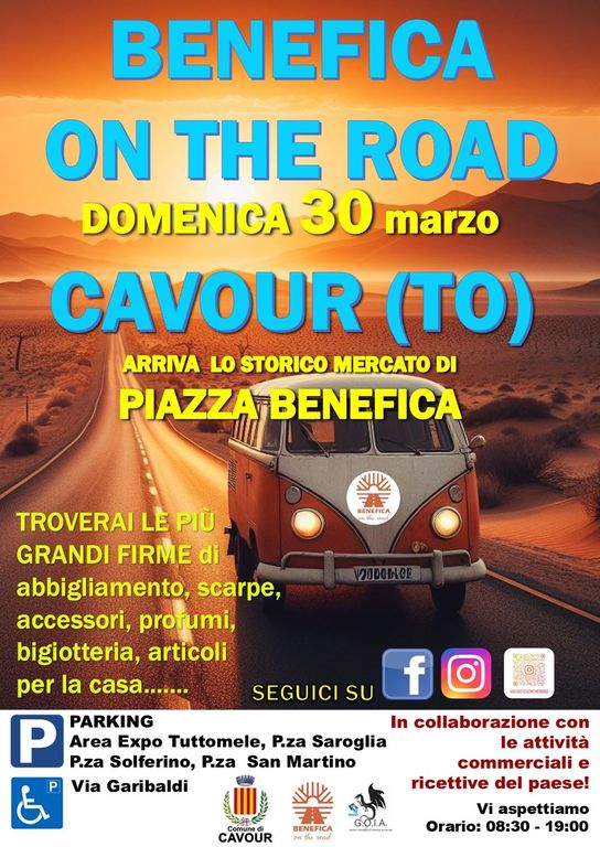 Dopo i successi nelle piazze delle città piemontesi PIAZZA BENEFICA ON THE ROAD torna a Cavour con il patrocinio del Comune di Cavour con nuove proposte, dalle 8,30 alle 19, dove gli storici stocchisti e ambulanti di Piazza Benefica porteranno le migliori marche e firme di abbigliamento, calzature, accessori, profumi, bigiotteria e articoli per la casa Made in Italy con oltre 50 espositori per accontentare tutti i gusti e le esigenze di stile e di moda dei visitatori.