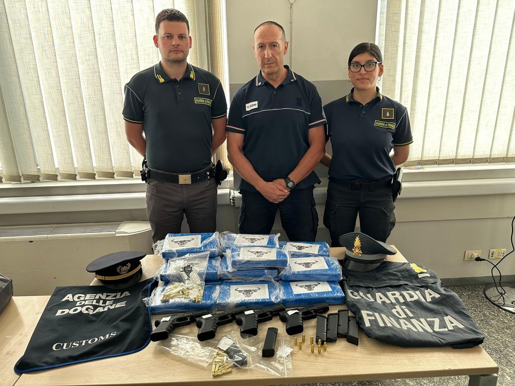 Alla luce degli elementi emersi e date le palesi incongruenze nelle dichiarazioni fornite, gli operanti hanno deciso di sottoporre anche l’utilitaria ad un più adeguato controllo tecnico, all’esito del quale sono stati scoperti, sotto il pianale dell’autovettura, due doppifondi contenenti: 18 panetti di sostanza stupefacente del tipo cocaina, per un peso complessivo di oltre 18 kg, ma anche quattro pistole Glock cal. 9*19, sei caricatori, di cui due comprensivi di colpi, e cinquanta proiettili sfusi.