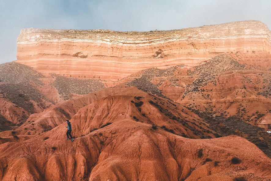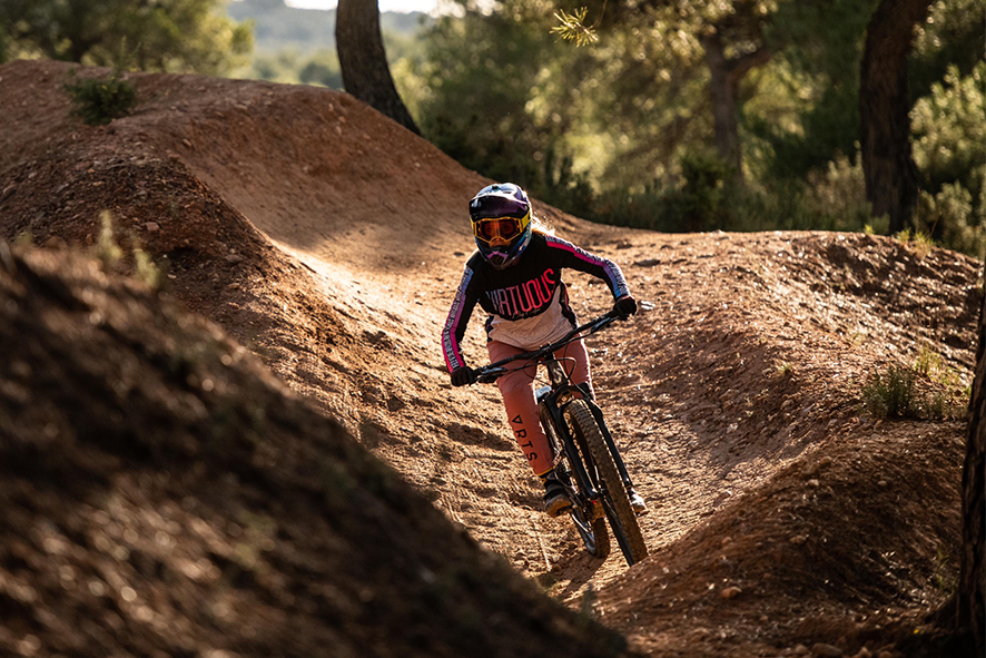 Prima tappa Barcellona, dove abbiamo visitato il leggendario La Poma Bike Park. È un luogo iconico per chi pratica dirt jump, una disciplina della mountain bike che consiste nell’eseguire salti e acrobazie su rampe di terra. Entrare lì è stato come vivere un sogno: bambini, atleti pro e molte ragazze che si allenavano insieme. Ho percepito un ambiente davvero inclusivo e stimolante. L’emozione era così forte che per le prime due ore non sono riuscita nemmeno a salire in bici, poi non sarei più scesa dalla sella! Ma, uno dei momenti che non posso dimenticare è stata l’avventura nel deserto del Teruel. Viaggiavamo di notte e siamo arrivati con una fitta nebbia. Al mattino, con il sorgere del sole, davanti a noi si è aperto uno scenario straordinario: rocce friabili, canyon scolpiti dal vento, colori caldi che sfumavano dal marrone al crema. Ci siamo messi subito al lavoro: con Ivan abbiamo esplorato il terreno per costruire delle linea di freeride, ovvero un percorso non tracciato che il rider disegna autonomamente sfruttando le forme del paesaggio. Io, oltre a essere biker, sono anche trail builder — realizzo e mantengo sentieri per la mountain bike — quindi per me è stato davvero entusiasmante trovarmi in un luogo così unico. In quel paesaggio quasi lunare, circondati da rapaci che volteggiavano sopra di noi, ho percepito una connessione fortissima con l’ambiente.