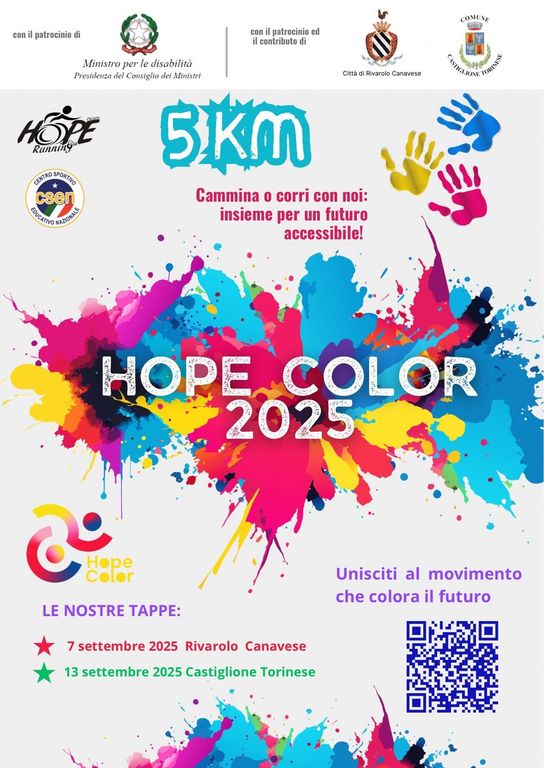La Hope Color di Rivarolo Canavese si fregia del patrocinio del Ministro per le Disabilità della Repubblica Italiana, Alessandra Locatelli, concesso il patrocinio per tutti gli eventi Hope Color in programma nel 2025. Una grandissima soddisfazione per lo stesso Giovanni Mirabella, insignito nel dicembre del 2023 dell’onorificenza di Cavaliere della Repubblica Italiana, e per i tanti volontari dell’associazione chivassese, che dal 2018 ad oggi si impegnano quotidianamente nel favorire l’inclusione sociale attraverso lo sport e celebrare la diversità.