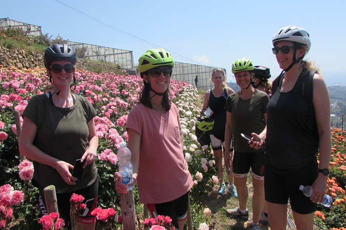 Uno dei più apprezzati parte dalla ciclabile e porta verso l’entroterra. Dopo una prima salita al Poggio, celebre per la Milano–Sanremo, si entra nei caruggi rapiti dal fascino del Borgo. Poi si attraversa il roseto di Antonio Marchese, un ibridatore che mi ha dato fiducia e mi permette di portare dentro i partecipanti. Si prosegue fino a Ceriana, dove vale la pena fermarsi a scoprire chiese e confraternite. Da lì, uno sterrato tra ulivi e terrazzamenti porta verso Bussana Vecchia, paese rinato grazie agli artisti. La giornata si chiude con un rientro dolce, magari un aperitivo vista mare. È un tour che mescola natura, cultura e socialità: l’essenza del cicloturismo.