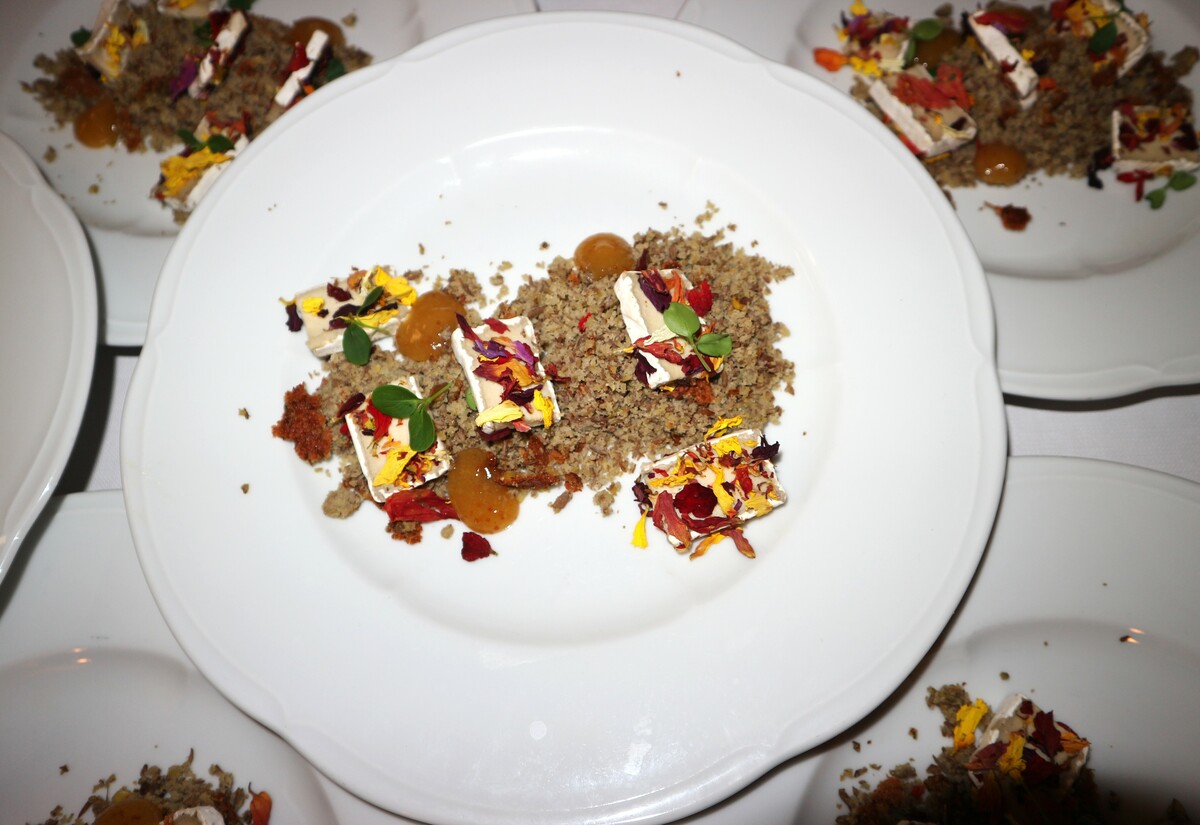 L’Antipasto ha stupito i presenti con un cestino di pasta sfoglia ripieno di hummus al basilico e verdure arrostite, con germogli e fiori eduli, tra cui tagete e calendula,  per un perfetto equilibrio tra gusto, colore e leggerezza, ancora una volta accompagnato dal Marengo DOC Acquesi.
