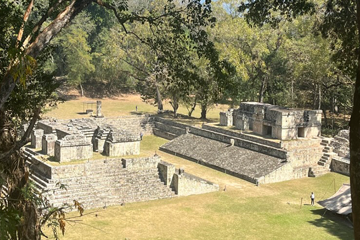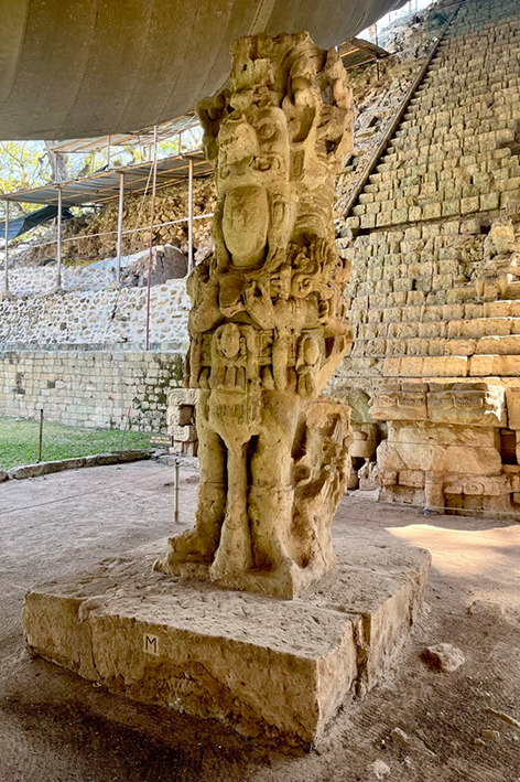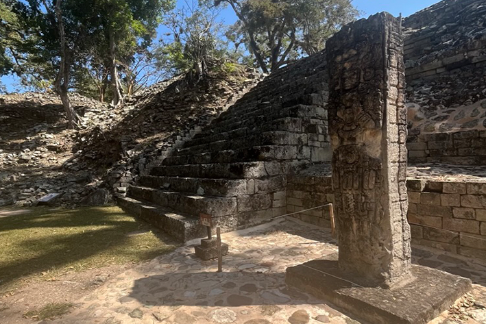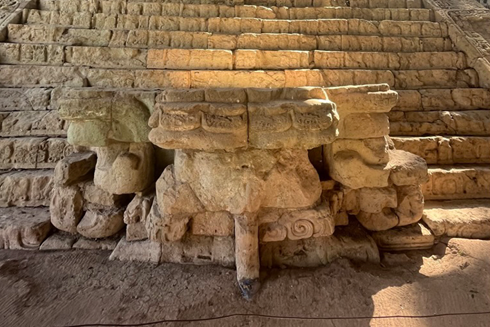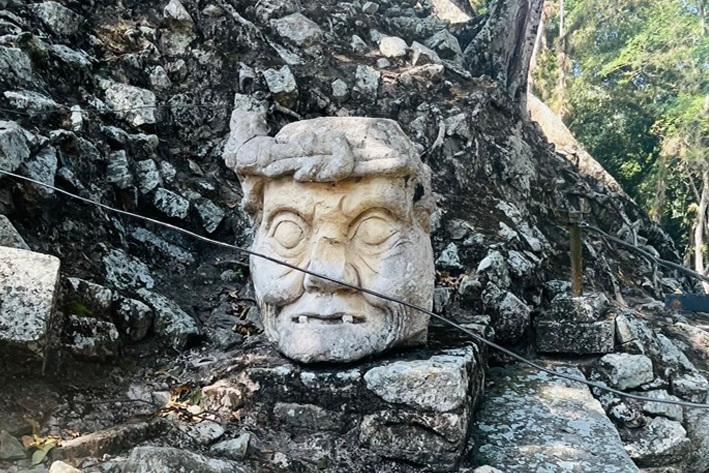 Le prime rovine compaiono dopo pochi passi: muri bassi, scalinate, figure scolpite. Le steli raccontano re e dei, vite che si sono fatte pietra. Una, più imponente, raffigura “18 Conigli”, il sovrano che fece di Copán un centro d’arte e spiritualità. Il suo volto, scolpito con un’eleganza che sfida l’erosione, guarda ancora verso l’orizzonte. Più avanti, la Scalinata dei Geroglifici si erge come una montagna di simboli. I glifi, incisi nei gradini, narrano storie di dinastie, battaglie, sacrifici. Alla base, figure mitiche sorreggono la struttura, come se la fede avesse ancora un peso fisico. Intorno, la giungla osserva in silenzio. Gli uccelli volano bassi, custodi inconsapevoli di un’eredità millenaria. Il vento muove appena le foglie, e per un momento tutto sembra tornare al principio: la pietra, la selva, il respiro della terra. Camminando si percepisce un equilibrio raro, una continuità tra natura e memoria. Copán non parla ad alta voce: sussurra, e chiede ascolto. È un luogo dove il passato non si mostra, ma si lascia intuire, come un’eco nel verde.