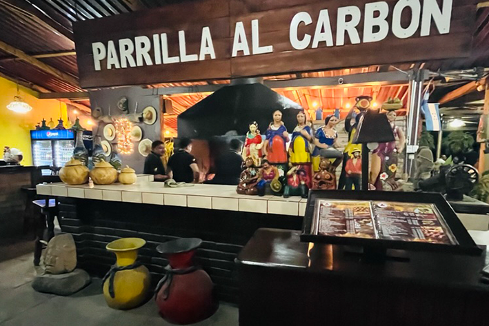 Il mercato è un mondo a parte. I banchi di legno sono carichi di papaie, banane, meloni, e il profumo dolce della frutta si mescola a quello del mais arrostito. Ogni volto sembra raccontare una storia, ogni sorriso contiene un frammento di resistenza quotidiana. Nel pomeriggio, la luce si fa più morbida. Il sole scivola sui tetti, le ombre si allungano, il rumore delle motociclette si confonde con le voci. Quando cala la sera, il villaggio si accende di luci e profumi. I lampioni riflettono sulle pietre della strada, la musica latina esce dalle finestre aperte. Alla Parrilla al Carbón, un ristorante nel cuore del paese, il fumo della brace si alza lento, si mescola al chiacchiericcio e al tintinnio dei bicchieri. Dietro il bancone, anfore colorate e statue di terracotta vegliano sul fuoco. Tutto è essenziale e autentico: il sapore del mais, il profumo del legno, la calma nel servizio. Gli ospiti parlano piano, come se il rispetto per quel luogo imponesse silenzio anche nei momenti di festa.
