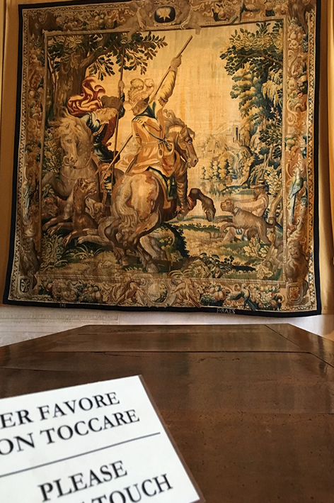 La sala delle carrozze invece, riporta in superficie il movimento. Gli interni in velluto, gli stemmi dorati, le ruote perfette: oggetti immobili che raccontano il viaggio come privilegio. Qui lo spostamento non è esplorazione ma rituale, una coreografia della distanza. Davanti a quei capolavori fermi, si intuisce quanto il potere, anche in movimento, restasse confinato dentro una propria cornice. In una sala laterale, un arazzo racconta una battuta di caccia. Figure minuscole, cavalli lanciati, alberi in fiore. Sotto, un cartello invita a non toccare. Ma la tentazione è forte: toccare per capire, per verificare quanto di quel mondo sopravvive nella materia. Tutto qui parla di un passato che resiste, anche se ha perso la sua voce. Dalla terrazza della Reggia, la vista si apre verso i giardini e oltre, verso la linea delle Alpi. È una prospettiva progettata, quasi teatrale. Juvarra la voleva così: una fuga ottica che proiettasse la grandezza della corte nella natura. Oggi, in quella stessa direzione, si estendono siepi, sentieri e fontane. Il paesaggio è cambiato, ma il ritmo è rimasto.