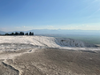 Lasciato questo luogo, la pianura riprende la parola. Per chilometri non accade quasi nulla. Poi la superficie cambia colore. Una scarpata bianca appare come un errore ottico nel paesaggio: Pamukkale. Le terrazze calcaree non sono un effetto scenografico ma il risultato di un processo millenario. L’acqua termale deposita carbonato di calcio, strato dopo strato. Il bianco non è candore: è accumulo. È il segno visibile di un tempo che sedimenta con pazienza. Camminare su quelle superfici significa percepire una materia che continua a trasformarsi anche quando sembra cristallizzata. Le vasche riflettono il cielo, ma sotto la superficie l’acqua lavora ancora. Sopra le terrazze si estendono le rovine di Hierapolis. Teatro, necropoli, strade ortogonali: la città romana osservava la valle con sicurezza ingegneristica. Qui natura e progetto umano condividono lo stesso panorama. La pietra scavata dall’uomo e quella depositata dall’acqua convivono senza conflitto. Pamukkale non racconta una vittoria, ma una coabitazione. La solidità come visione nei “secoli dei secoli”.