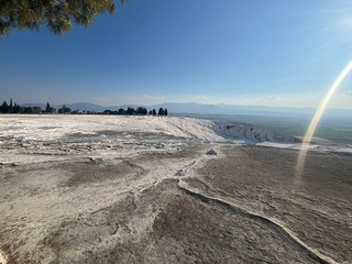 Lasciato questo luogo, la pianura riprende la parola. Per chilometri non accade quasi nulla. Poi la superficie cambia colore. Una scarpata bianca appare come un errore ottico nel paesaggio: Pamukkale. Le terrazze calcaree non sono un effetto scenografico ma il risultato di un processo millenario. L’acqua termale deposita carbonato di calcio, strato dopo strato. Il bianco non è candore: è accumulo. È il segno visibile di un tempo che sedimenta con pazienza. Camminare su quelle superfici significa percepire una materia che continua a trasformarsi anche quando sembra cristallizzata. Le vasche riflettono il cielo, ma sotto la superficie l’acqua lavora ancora. Sopra le terrazze si estendono le rovine di Hierapolis. Teatro, necropoli, strade ortogonali: la città romana osservava la valle con sicurezza ingegneristica. Qui natura e progetto umano condividono lo stesso panorama. La pietra scavata dall’uomo e quella depositata dall’acqua convivono senza conflitto. Pamukkale non racconta una vittoria, ma una coabitazione. La solidità come visione nei “secoli dei secoli”.